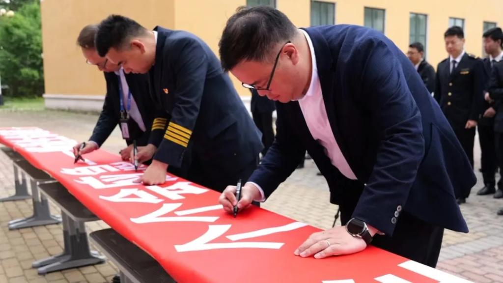 随后,与会师生进行安全承诺签名,双基地同步观看“安全生产月”主题宣传片。