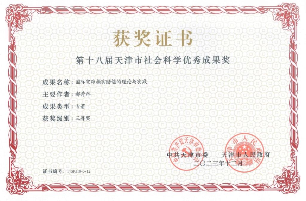 12月7日,天津市社会科学界联合会公示第十八届天津市社会科学优秀成果奖评选结果,我院郝秀辉教授专著《国际空难损害赔偿的理论与实践》荣获第十八届天津市社会科学优秀成果奖三等奖。
