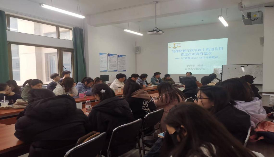 2024年3月4日下午,中国民航大学法学院邀请吉林大学法学院教授、博士生导师李海平在法学院模拟仲裁庭作了题为“发挥化解行政争议主渠道作用推进法治政府建设—《行政复议法》修订内容解读”的专题讲座。本次讲座由法学院院长郝秀辉教授主持,法学院2022级本科生、2023级宪法与行政法专业研究生听取了讲座。