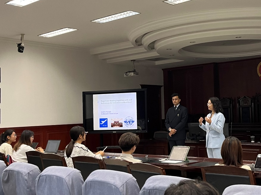 2024年9月13日上午,法学院“涉外航空法治高端学术沙龙”在模拟法庭教室圆满举办。尼泊尔加德满都大学法学院副教授尤琪查·桑格卢拉(Yugichha Sangroula)女士和尼泊尔加德满都大学法学院学术行政助理西提兹·帕拉朱利(Kshitiz Parajuli)先生为法学院本科与研究生同学就“模拟法庭竞赛经验交流与分享:解决问题导向下的法律研究方法”的主题进行了交流。本次讲座由法学院孙旭博士主持,法学院助理教授孟媛媛、法学院黄如青博士作为讲座与谈人,法学院本科生、研究生近百人参加。