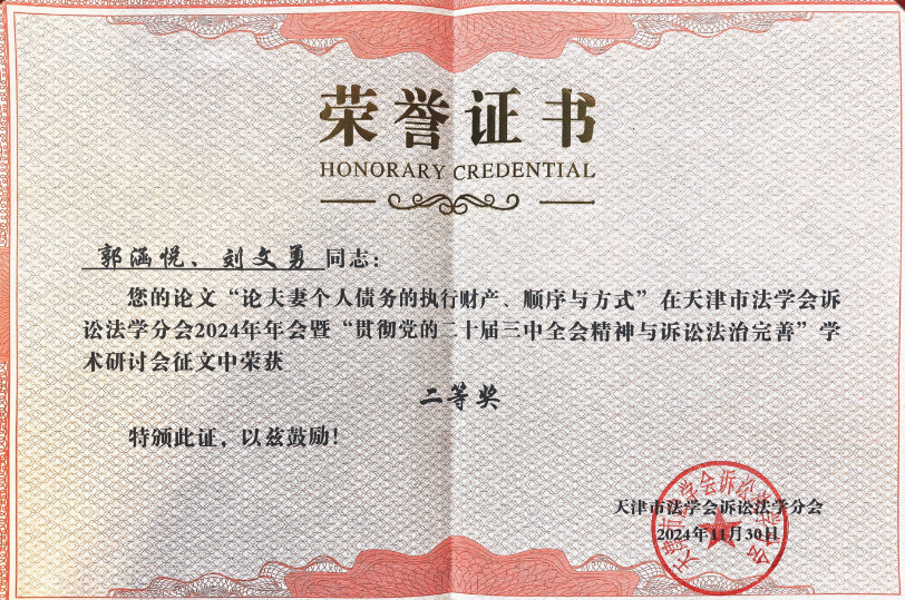 我院本科生郭涵悦与刘文勇讲师共同撰写的论文《论夫妻个人债务的执行财产、顺序与方式》荣获本届年会论文二等奖,并被收录于年会论文集。郭涵悦同学受邀在本次会议做主题发言。