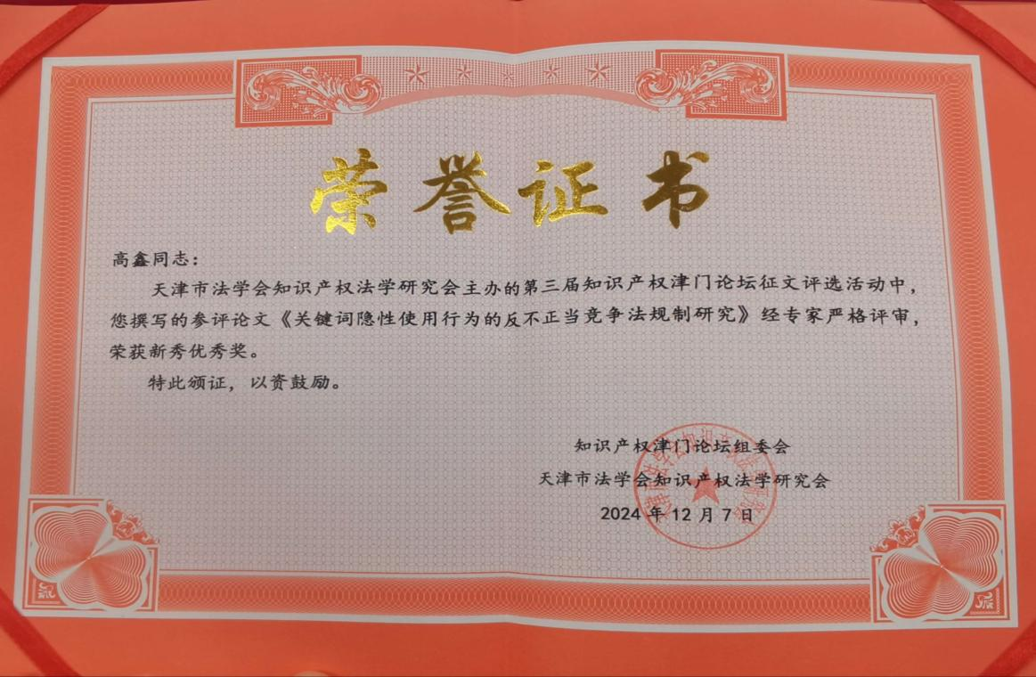 本次论坛的优秀论文评选工作经过严格的专家评审,充分保证评审工作的公正性与严肃性。组委会还对本次论坛中涌现出的优秀论文提出了中肯的修改建议,并计划推荐给合作学术期刊发表。我院多名学生的投稿文章被会议论文集收录,其中2023级硕士研究生高鑫的论文《关键词隐性使用行为的反不正当竞争法规制研究》经专家严格评审,荣获新秀优秀奖。