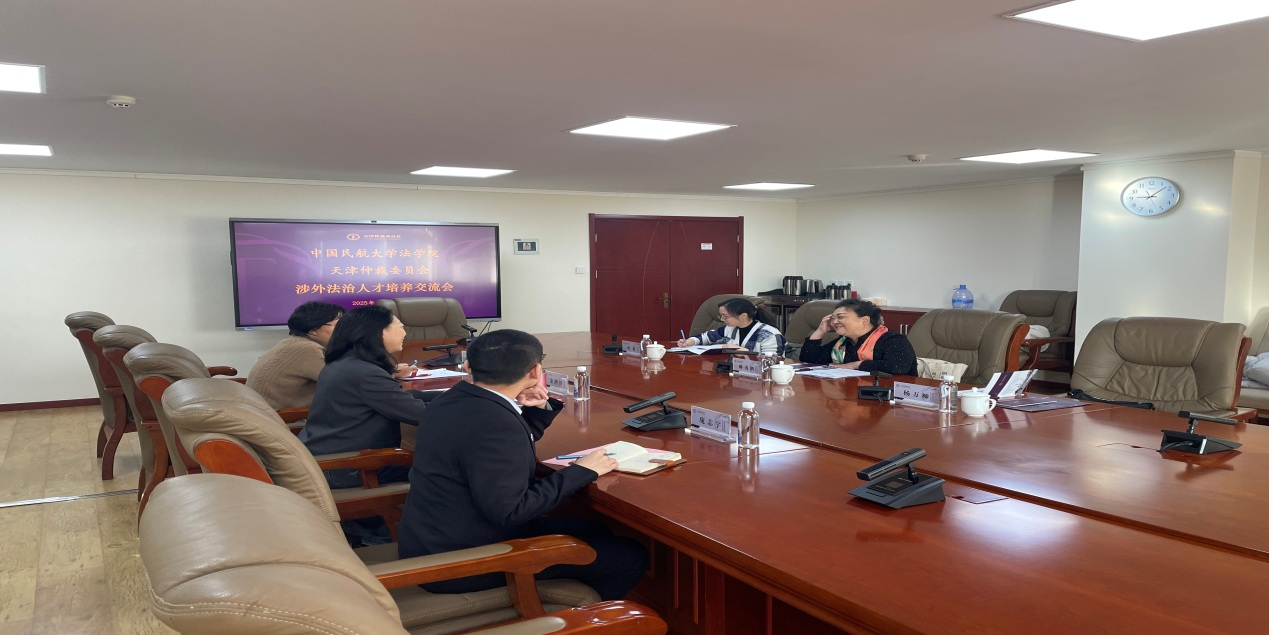 天津仲裁委员会金融仲裁中心主任孙淑宇、金融仲裁中心秘书庞志宇、我院国际法教研室杨万柳副教授和孙莉博士都分别畅谈了合作共建平台、培养涉外仲裁人才的一些想法和建议。我院高度重视涉外法治人才培养工作,自获批教育部“涉外法治人才协同培养创新基地(培育)”以来,积极与实务部门开展深入合作和交流,取得很大实效。仲裁在航空纠纷解决领域具有独特优势,仲裁人才是涉外法治人才培养体系的必要组成部分。通过交流,在涉外法治人才共同培养方面达成了很多共识,我院与天津仲裁委员会今后将在涉外法治人才培养方面积极创新合作共建路径,共同打造涉外法治人才精准培养平台。