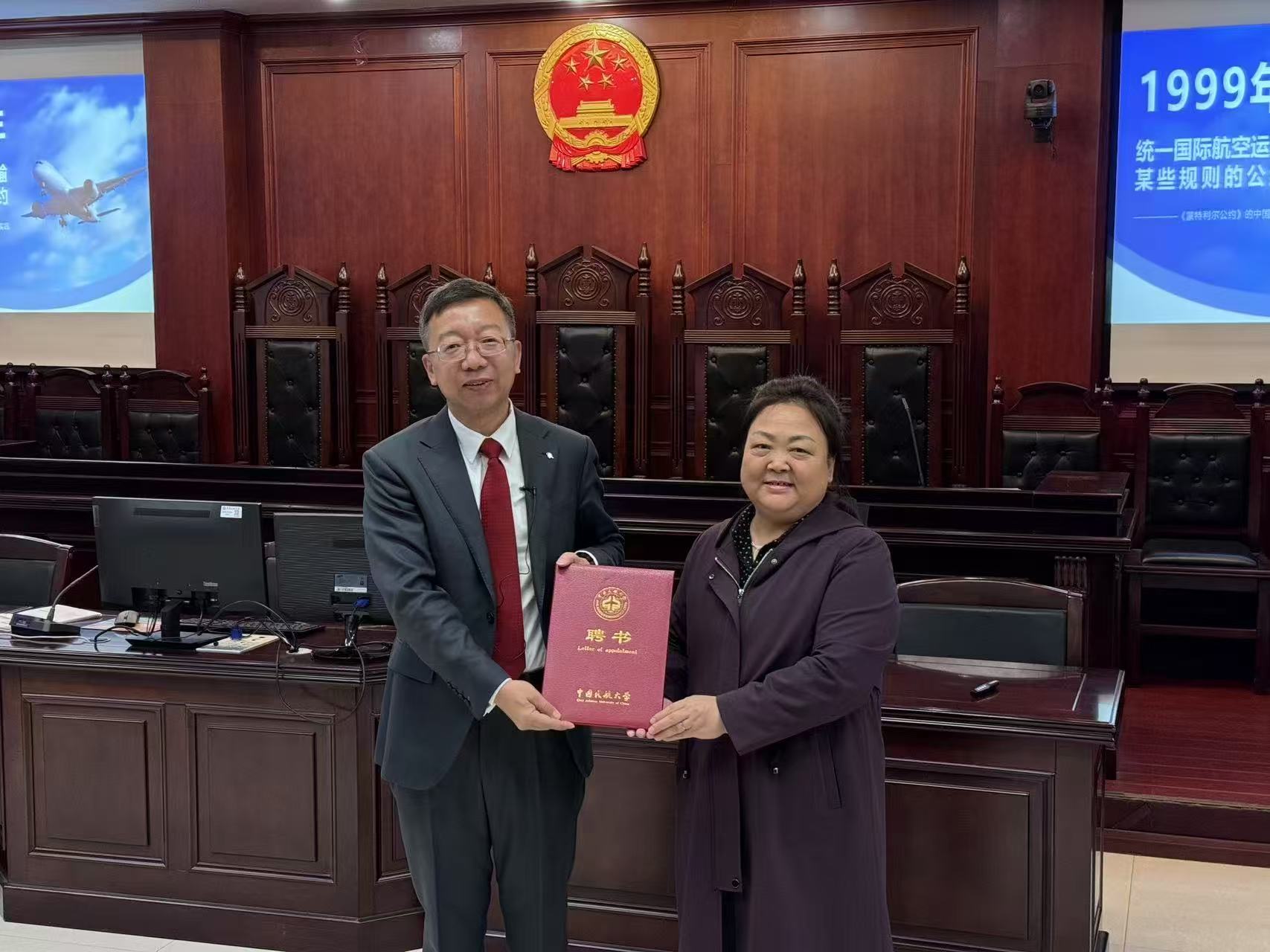 讲座接近尾声,中国民航大学法学院郝秀辉院长为仲裁员高峰先生颁发了聘书。作为我校的校外兼职导师,高峰先生聚焦航空法律实践中的法律适用问题,为我院师生们带来了一场精彩绝伦的专题讲座!