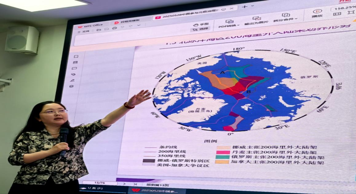 本期讲座主题为“中国参与北极治理的国际法律规制:历史经验与未来面向”。白佳玉教授围绕中国参与北极治理的理论与实践,从《联合国海洋法公约》中的“冰封区域条款”、航行权的冲突与协调、航道属性的定位、航行过程中的航道规则、外大陆架的划分等方面对北极治理的价值与意义、北极治理的基本法理、中国参与北极治理的国际法理论基础等问题进行了深入讲解,同时,结合我国参与北极治理的历史经验,对我国现行的北极政策进行解读,然后,从积极建立双边与多边合作机制、多元发展北极事务合作主体、履行北极公域环境保护责任等方面对未来中国参与北极治理的方向提出建议。
