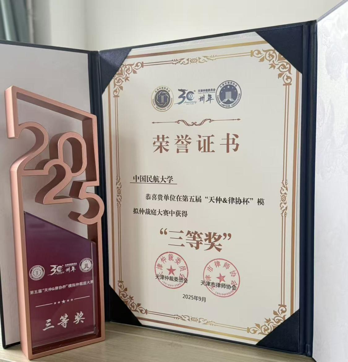 在天津仲裁委成立30周年之际,天津仲裁委员会、天津市律师协会、中国贸仲天津分会等多家单位联合举办了第五届“天仲&律协杯”模拟仲裁庭大赛。法学院刘文勇老师指导的蔡舒琳、曹雪影同学代表中国民航大学参加比赛,经过初赛、复赛的激烈角逐,最终荣获三等奖的优异成绩。