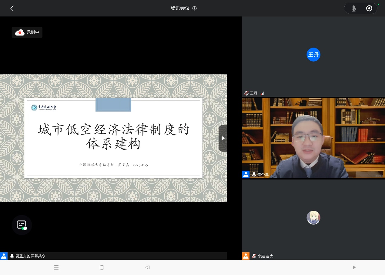 2025年11月5日晚,我院贾圣真副教授受邀参与“都市行政法学”课程授课,作为特邀专家进行了题为“城市低空经济法律制度的体系建构”的线上讲座。讲座由郑州大学法学院郑磊副教授主持,中国民航科学技术研究院李亚凝研究员参加讲座并进行评议。