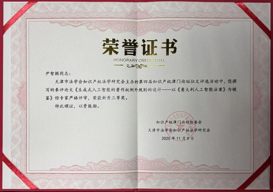 本次论坛的优秀论文评选工作经过严格的专家评审,充分保证评审工作的公正性与严肃性,秉持首届论坛的办会初衷,为让更多青年才俊展示才华,继续坚持保留实务和新秀组奖项。我院多名学生的投稿文章被会议论文集收录,其中2024级硕士研究生尹智颖的论文《生成式人工智能的著作权例外规则的设计——以<意大利人工智能法案>为镜鉴》经专家严格评审,荣获新秀三等奖。