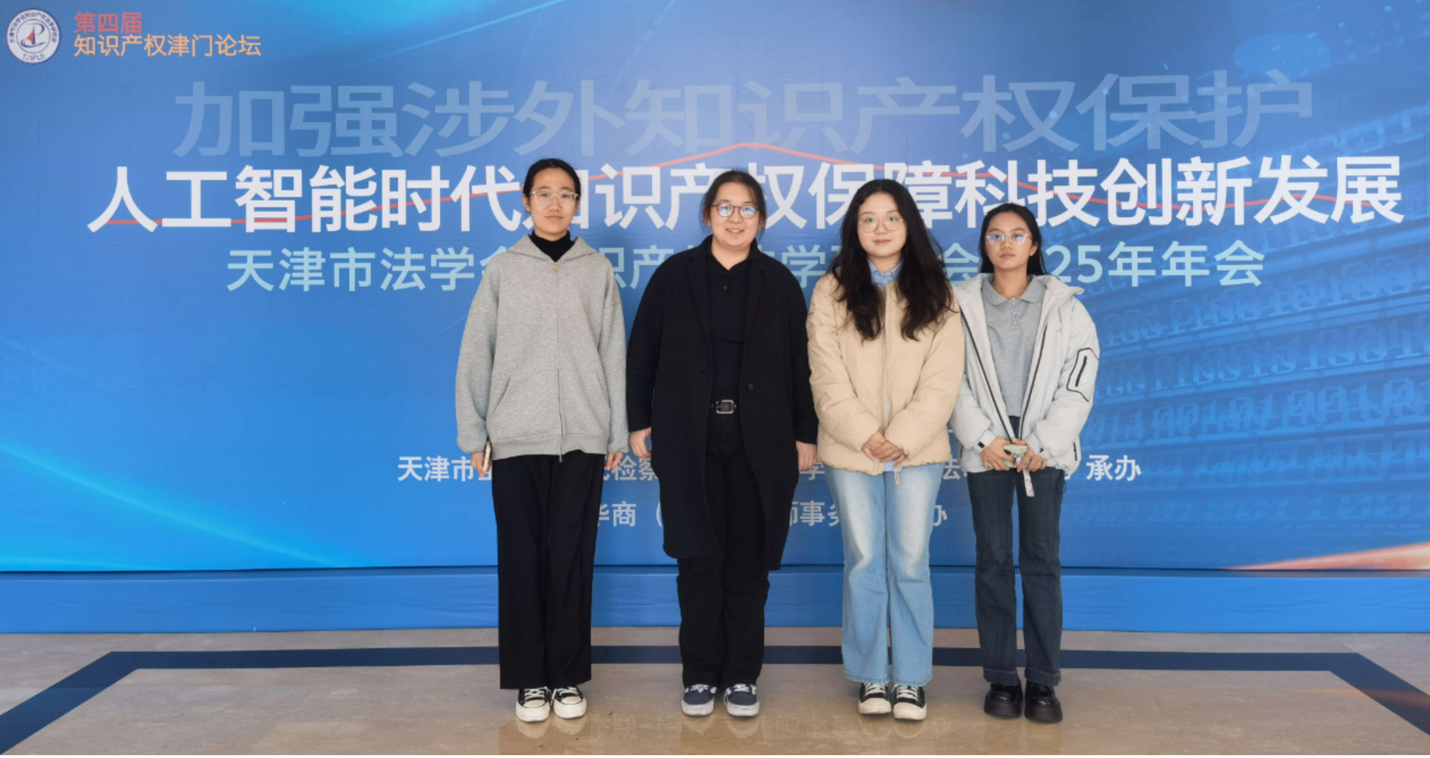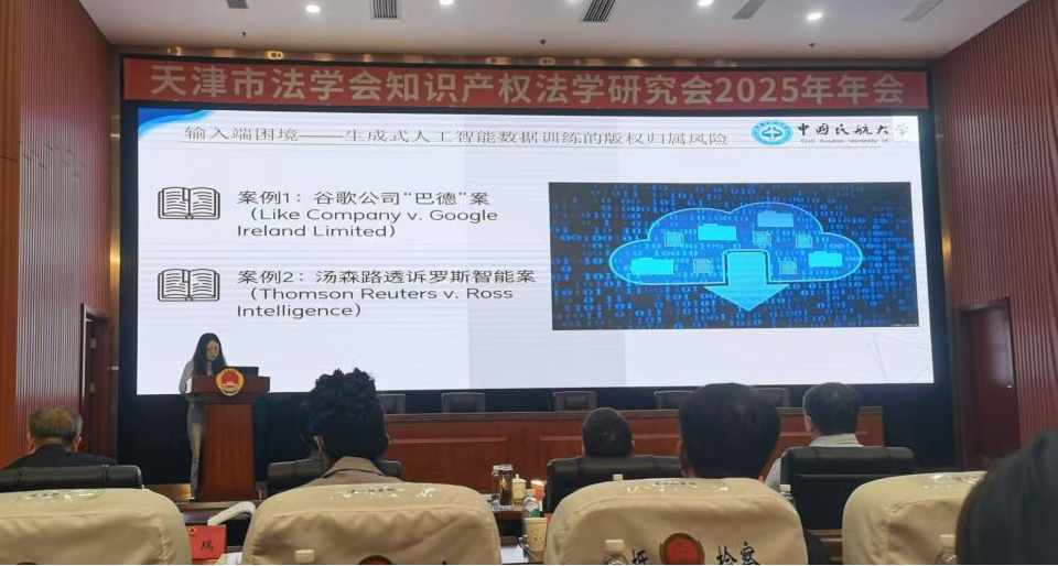 论坛的主题为“加强涉外知识产权保护 人工智能时代知识产权保障科技创新发展”。天津市法学会党组成员、专职副会长张劲枫,天津市宝坻区区委常委、区委政法委书记、区法学会会长刘坚,天津市知识产权局党组成员、副局长陈克俭,天津市宝坻区人民检察院党委书记、检察长张国岩与天津市人民检察院、天津市高级人民法院、河北省高级人民法院、天津市滨海新区法学会、天津市法学会知识产权法学研究会会长俞风雷教授出席,来自全国各地的知识产权行政管理部门、法院、检察院的实务精英,研究会理事、会员和各高校、律所、企业的专家学者150余人参加本次会议。我院青年教师赵乃馨博士、2024级研究生尹智颖、2023级本科生赵宸雪、2025级本科生缪若珊参加了会议。