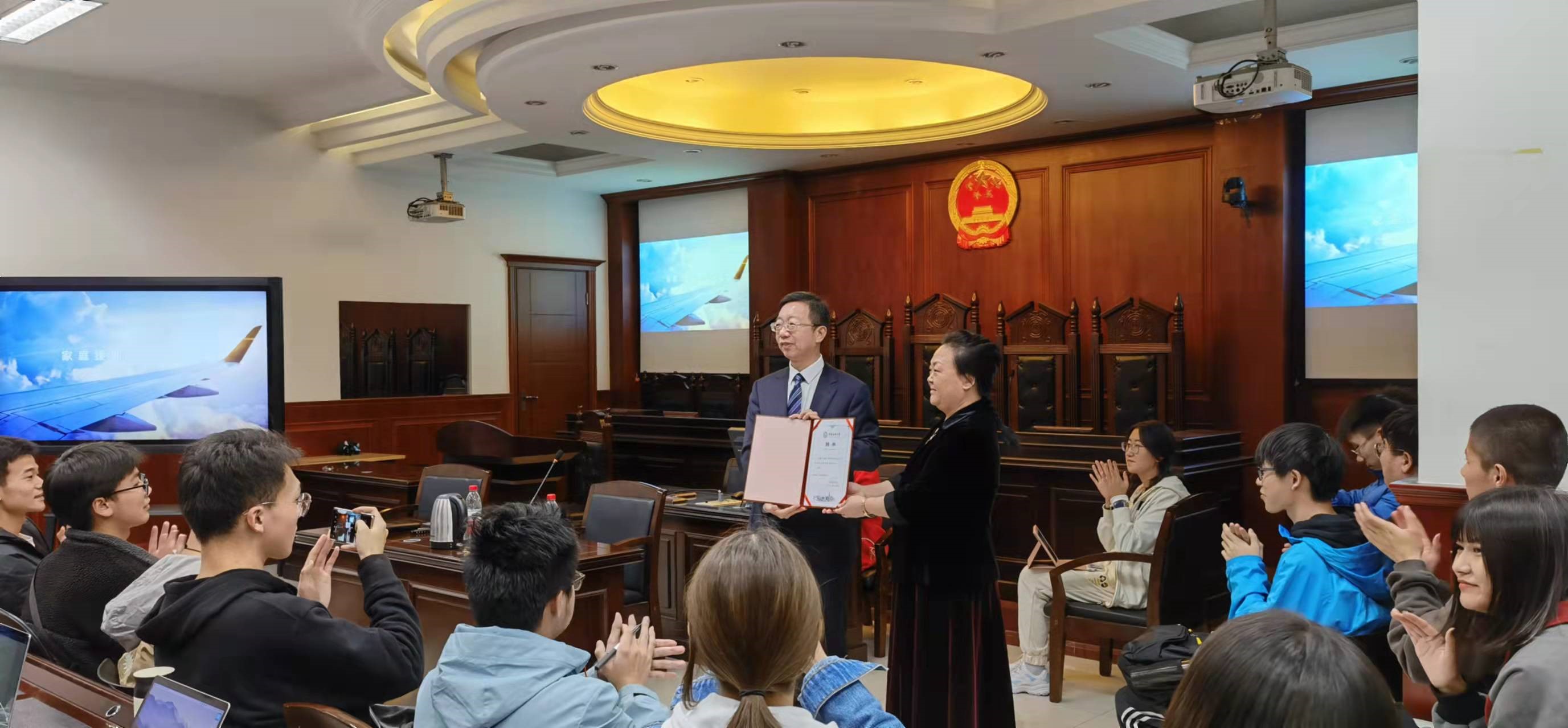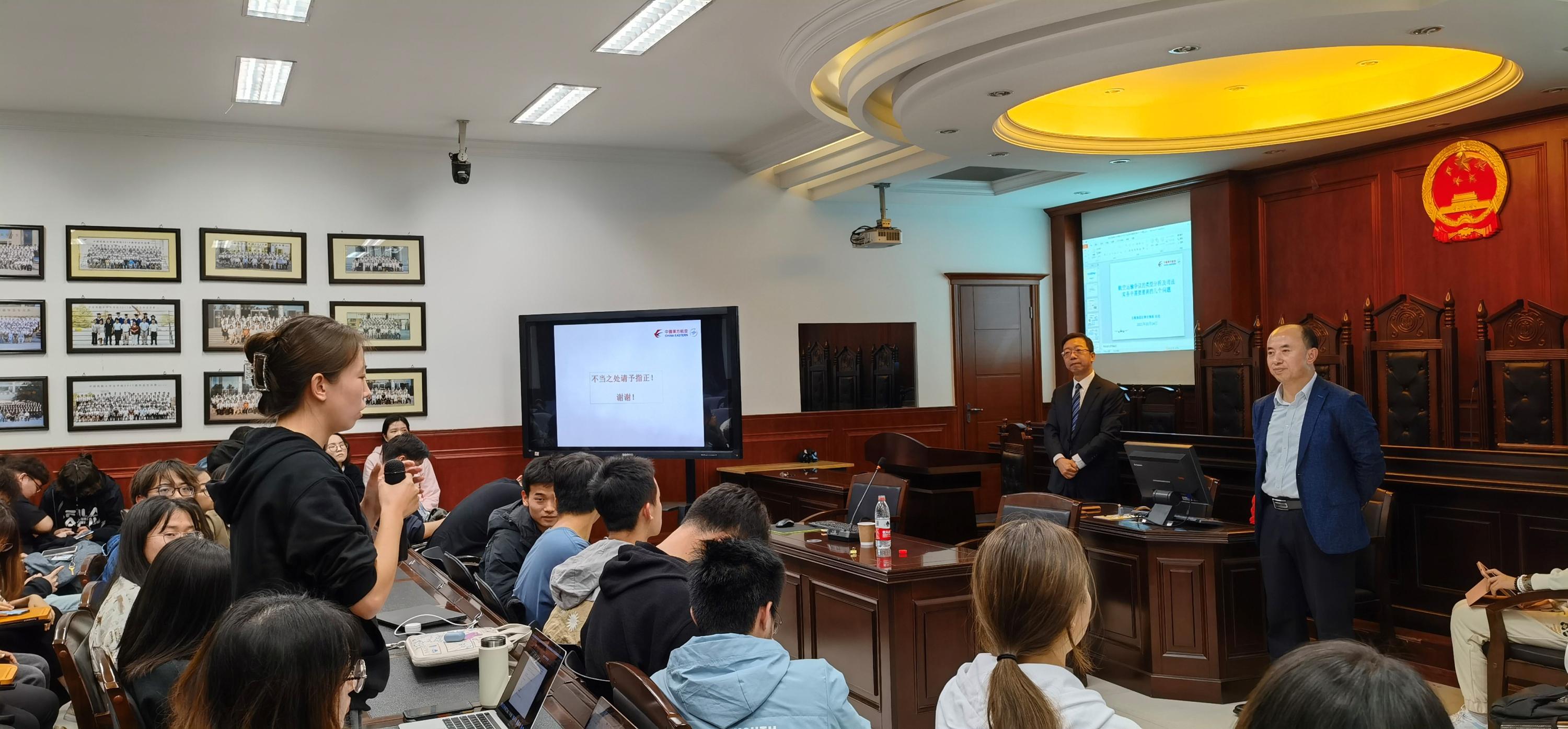 2021年10月14日晚法学院在南教二模拟法庭举行了“空难事故家庭援助法律问题”和“航空运输争议类型及司法实务”两个单元的航空法专题讲座。法学院师生100余人聆听了讲座,模拟法庭座无虚席。