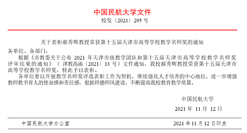 近日,天津市教委发布了《市教委关于公布2021年天津市级教学团队和第十五届天津市高等学校教学名师奖评审结果的通知》(津教高函〔2021〕33 号),中国民航大学法学院院长、法学教授郝秀辉荣获第十五届天津市高等学校教学名师奖。