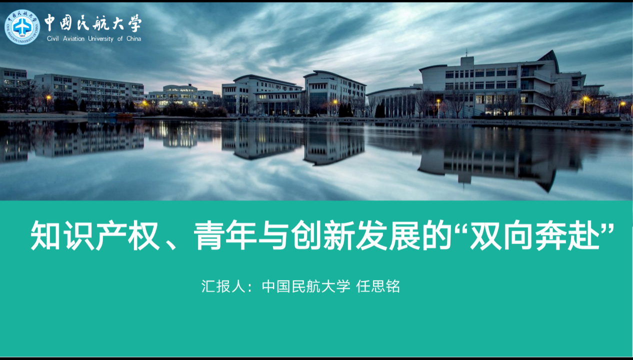 首先,中国民航大学法学院2018级学生,国家奖学金获得者,法学院团委副书记、支部团支书任思铭,以“从知识产权与青年谈创新发展”这一角度,进行了题为《知识产权、青年与创新发展的“双向奔赴”》的云分享发言。任思铭同学分享了自己学习习近平总书记在今年世界知识产权日对青年群体寄语的心得,并以“航空企业和青年在目标和精神上的情投意合”和“知识产权和青年的美好共振”两个角度展开了发言,讨论了知识产权与创新科学技术装备为民航安全提供的支撑和保障。并在发言结尾提出:黄金时代,不在过去,乃在将来。以青年之声呼吁全体青年携起手来,在知识产权制度不断激励青年的创新热情,知识产权事业与青年相互成就、交相辉映的时代,矢志报国、勇攀高峰、自强不息、锐意探索、敢于突破,掌握创新发展的主动权,与这个创新的时代同向同行。