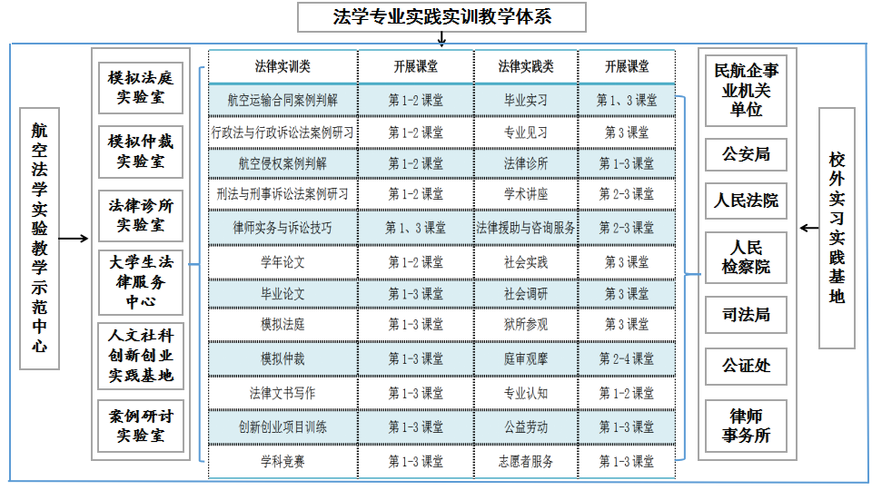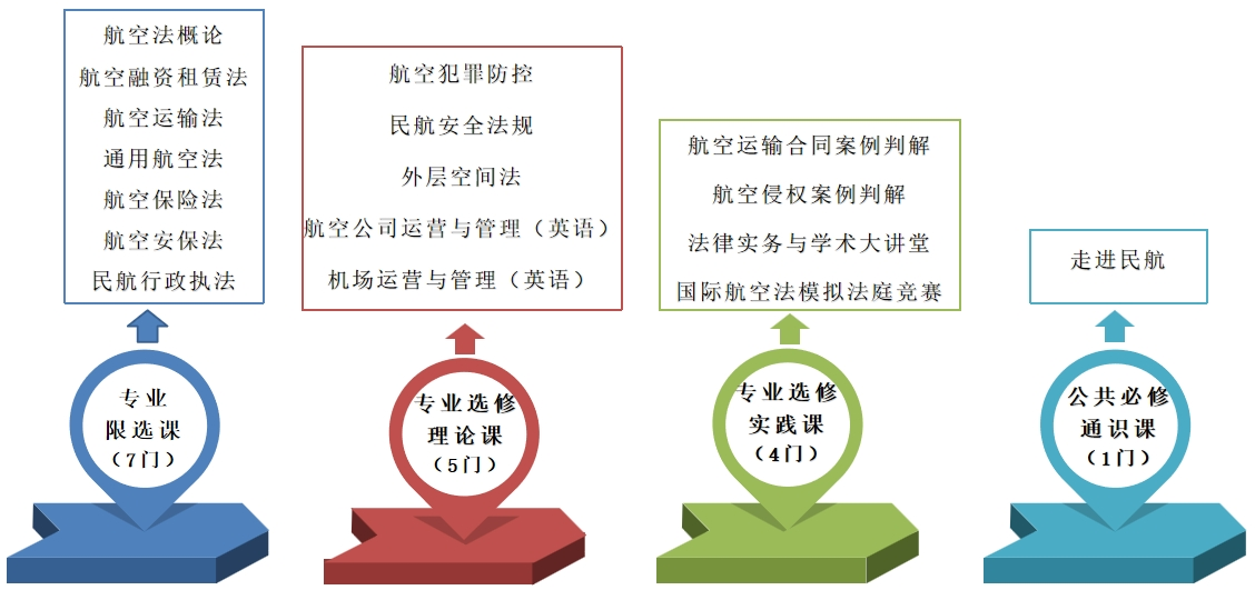 1.开发校本课程、追求专业特色发展。依托航空法学科研究,结合专业发展目标,自主开发设计“专业+通识、必修+选修、理论+实践”构成的17门特色课程。