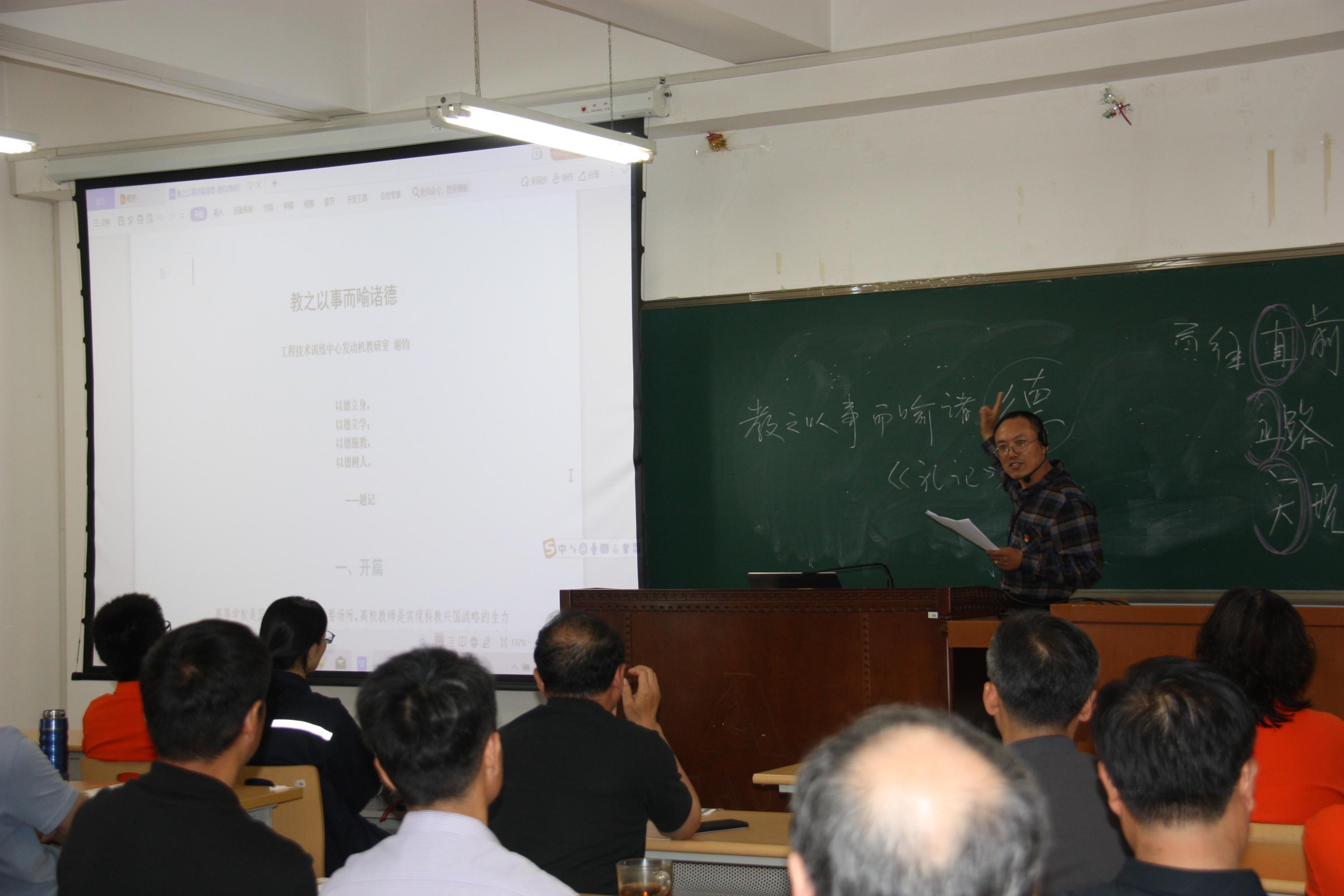 随后,中心2021年优秀共产党员发动机教研室谢钧老师分享了自己学习党史的收获和心得体会,他以《教之以事而喻诸德》为题,从理想信仰、正己修身、教书育人三个方面详细介绍了自己从教以来立足三尺讲台、潜心教书育人的先进事迹。这也是中心党委开展 “身边人讲身边事”系列活动的深入推进。