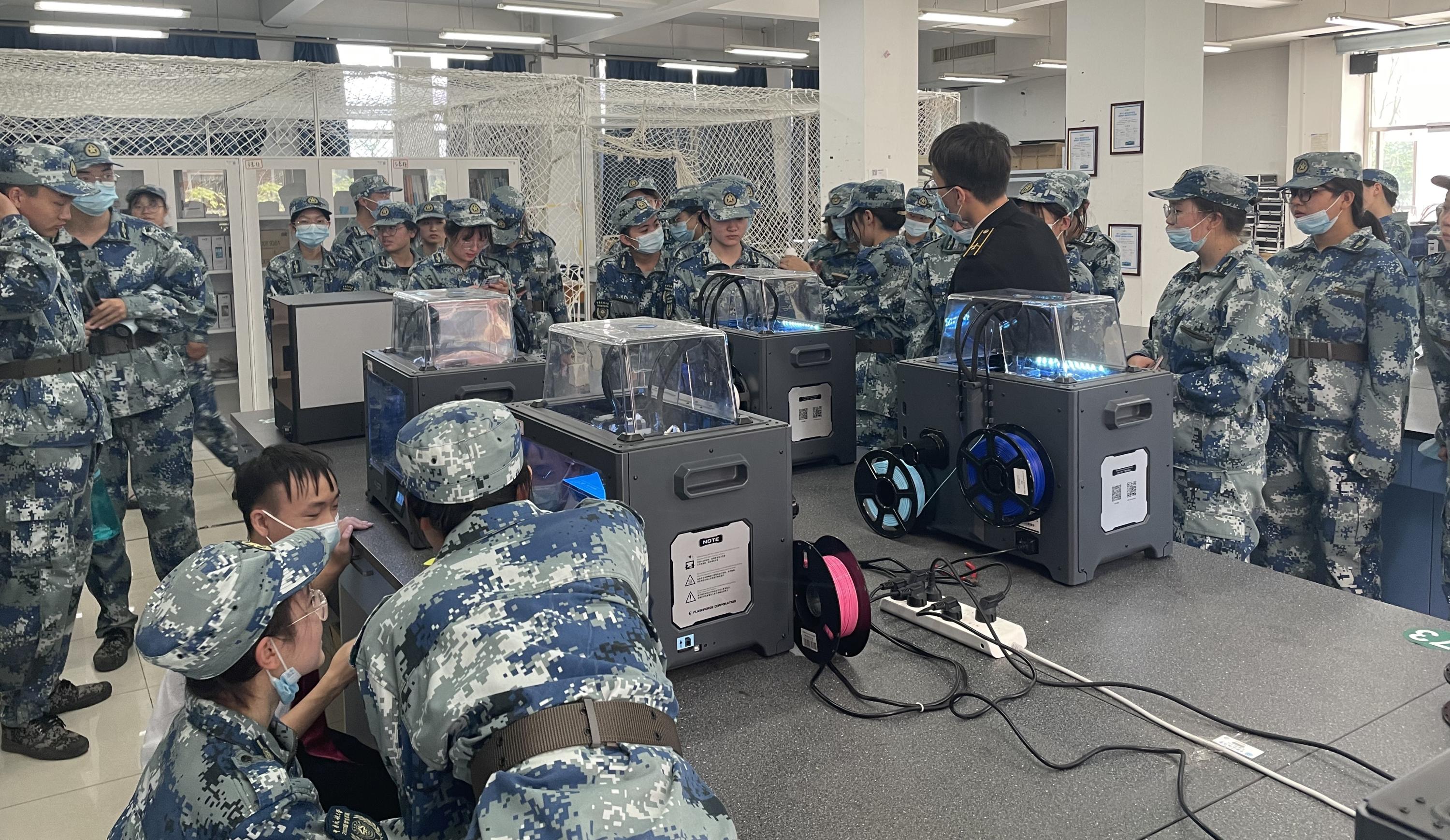 新生们身穿军训迷彩服、英姿飒爽地走进双创基地,先后参观了基地的创新创业教育成果展、创客工作室、模拟飞行体验区、四旋翼飞行器演示区、电脑鼠迷宫室和3D打印实训室等,随后观看了双创团队的宣传视频,聆听了优秀学长学姐们的经验分享。