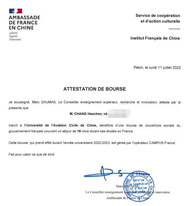 自2019年起,我校与法国驻华大使馆合作开展法国政府-高校合作奖学金“France Science Excellence”项目,迄今为止,已有11名学生获此殊荣。成功申请奖学金项目的同学将享有法国政府社会保险奖学金所提供的福利,同时他们还将享有法国本土大学生身份所享受的优待,包括免费参加全民社会保险等。