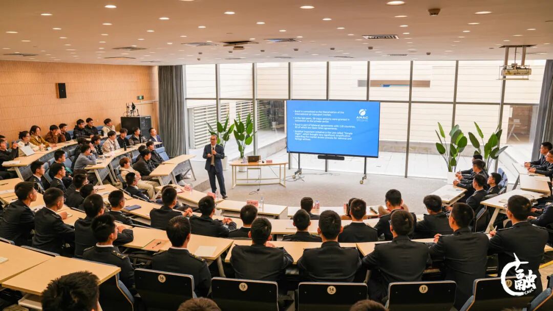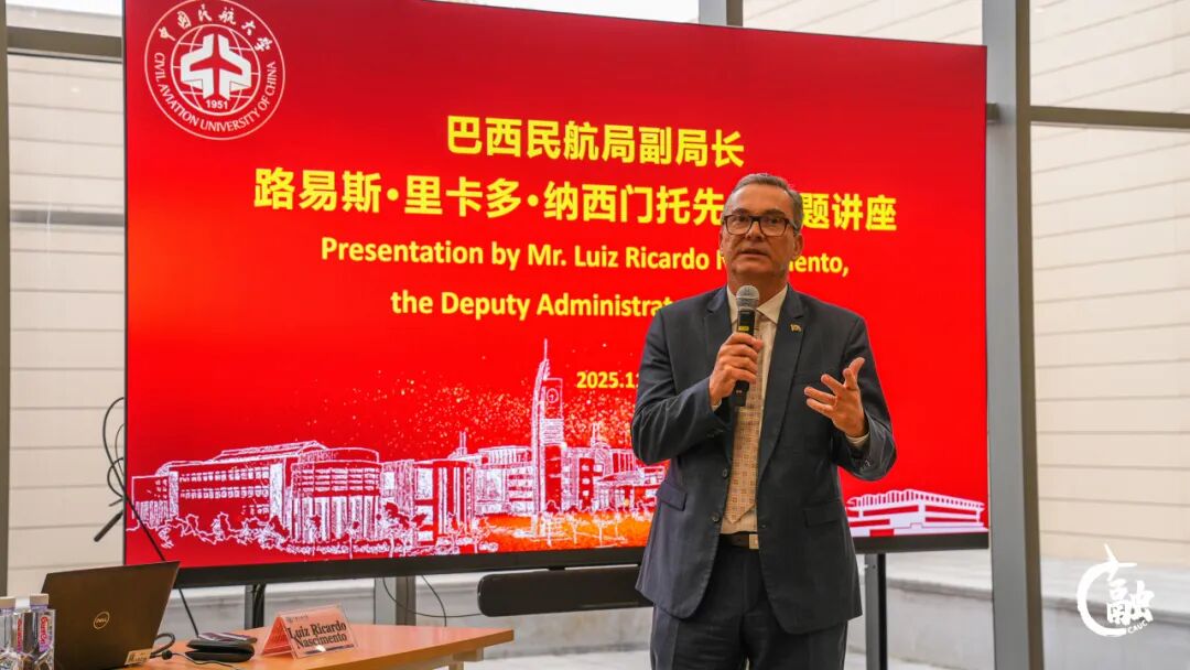 当日下午,宁河校区图书馆报告厅座无虚席,气氛热烈,路易斯·里卡多·纳西门托受邀作专题讲座。他系统阐述了巴西民航业概况、产业特色与未来趋势,深入分享了巴西在空管军民融合领域的实践经验,并强调了中巴合作对于两国民航人才培养的重要性。互动环节,现场氛围愈发活跃,学生们纷纷举手提问。