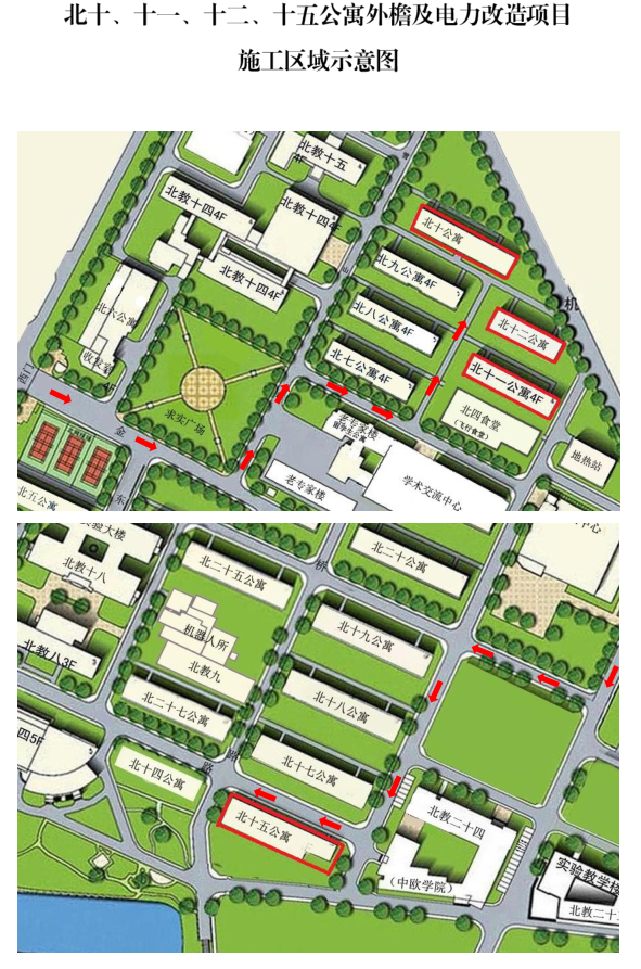 根据学校建设项目总体安排,定于2019年3月15日起,对北十、十一、十二、十五公寓外檐及电力改造项目进行施工,计划工期3月15日-5月15日,主要施工内容包括:公寓外檐改造、电力改造、污水改造等。
