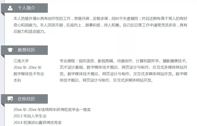 有些同学延续了学校里的风格,在个人评价时常常会写自己沟通能力强、有耐心、专注力高......而这些都需要有事实来证明。