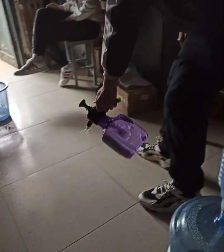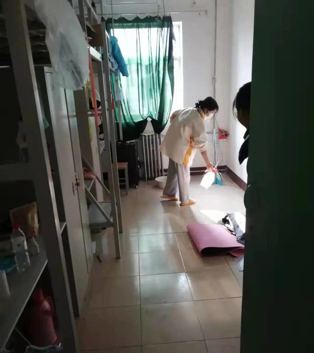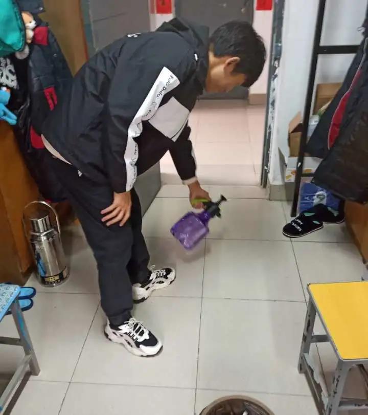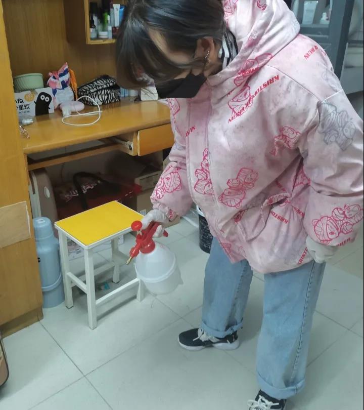 学院成立由辅导员老师带队指导,学生骨干组成的消毒小组,每日对分布在北2、3、14、17、18、22公寓的571间宿舍(其中男生宿舍471间,女生宿舍100间)进行全覆盖消毒液喷洒,将病毒传播源头扼杀在摇篮中。