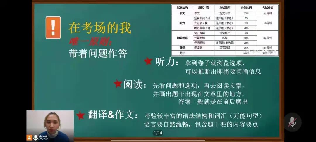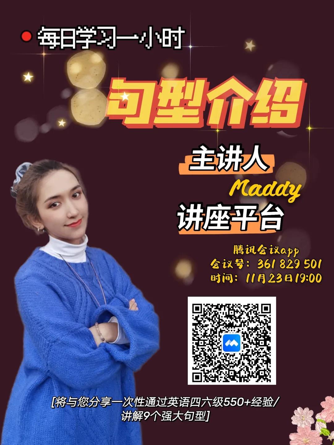 11月23日晚,学院举行“每日学习一小时”系列活动,即由麦地老师通过腾讯会议开展了主题为“每日学习一小时-九大句型介绍”的线上英语讲座。讲座吸引了众多同学参加,此次讲座目的在于引导学生以科学有效的方法和技巧备考大学英语四级考试,提升同学英语综合运用能力。