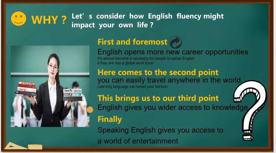 麦地老师以“Why-为什么要学英语”、“How-如何学好英语”以及“What-英语作文九大句型”作为讲座的三大模块,由浅入深地向同学介绍英语相关内容。她结合自身多语种掌握者的经历,向大家分享自己学习英语的经验体会;对于语言学习的“四大天王”-听、说、读、写,麦地老师运用平易近人的演说、生动有趣的表达分别给出了相应的实用性建议。最后讲解了英语中常见的“九大句型”,强化了同学们的语法基础,如果句型分析能力能有提高,不仅仅是对写作和翻译大有助益,也是做好听力和阅读不可或缺的一环。