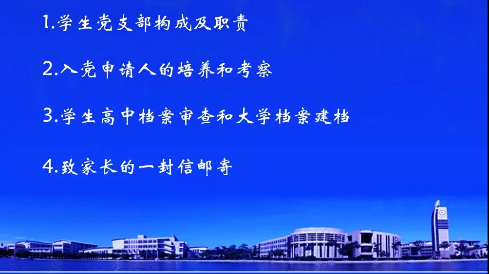 最后,史悦强老师从学生党支部构成及职责、入党申请人培养和考察、学生高中档案审查和大学档案建档、致家长的一封信邮寄等方面内容进行一一讲解。
