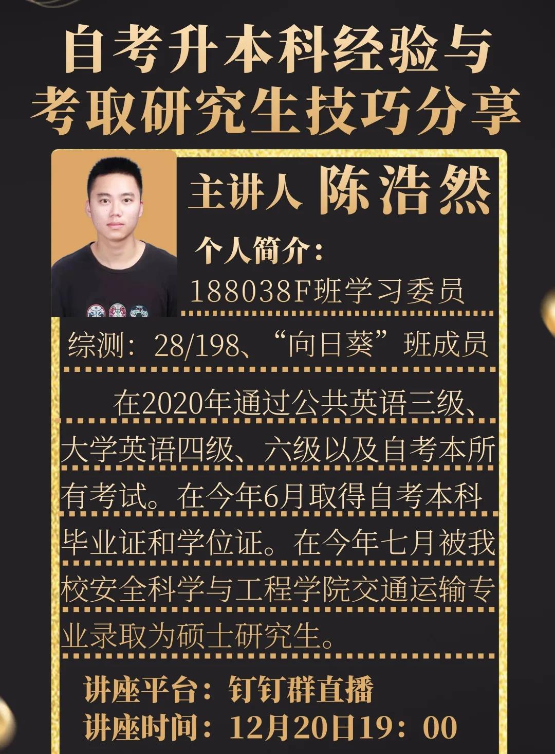 为了让同学们进一步了解自考升本科考试和研究生考试相关工作,让同学们得到更丰富的考试经验,拥有更明确的奋斗目标,从而让同学们拥有更好的职业发展。职业技术学院于12月20日19点通过钉钉直播的形式组织了校友讲座,各年级同学积极参加。