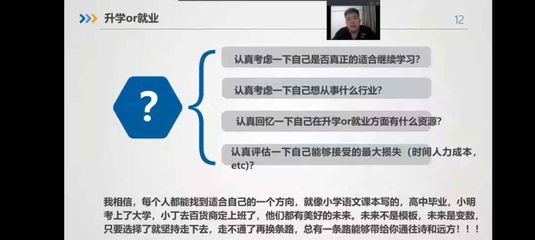 就业方面,学长建议大家在工作岗位上多多实践,增加自己的实践经历,多方面提升自我技能。面对挑战时,敢于迎接挑战,突破自我。