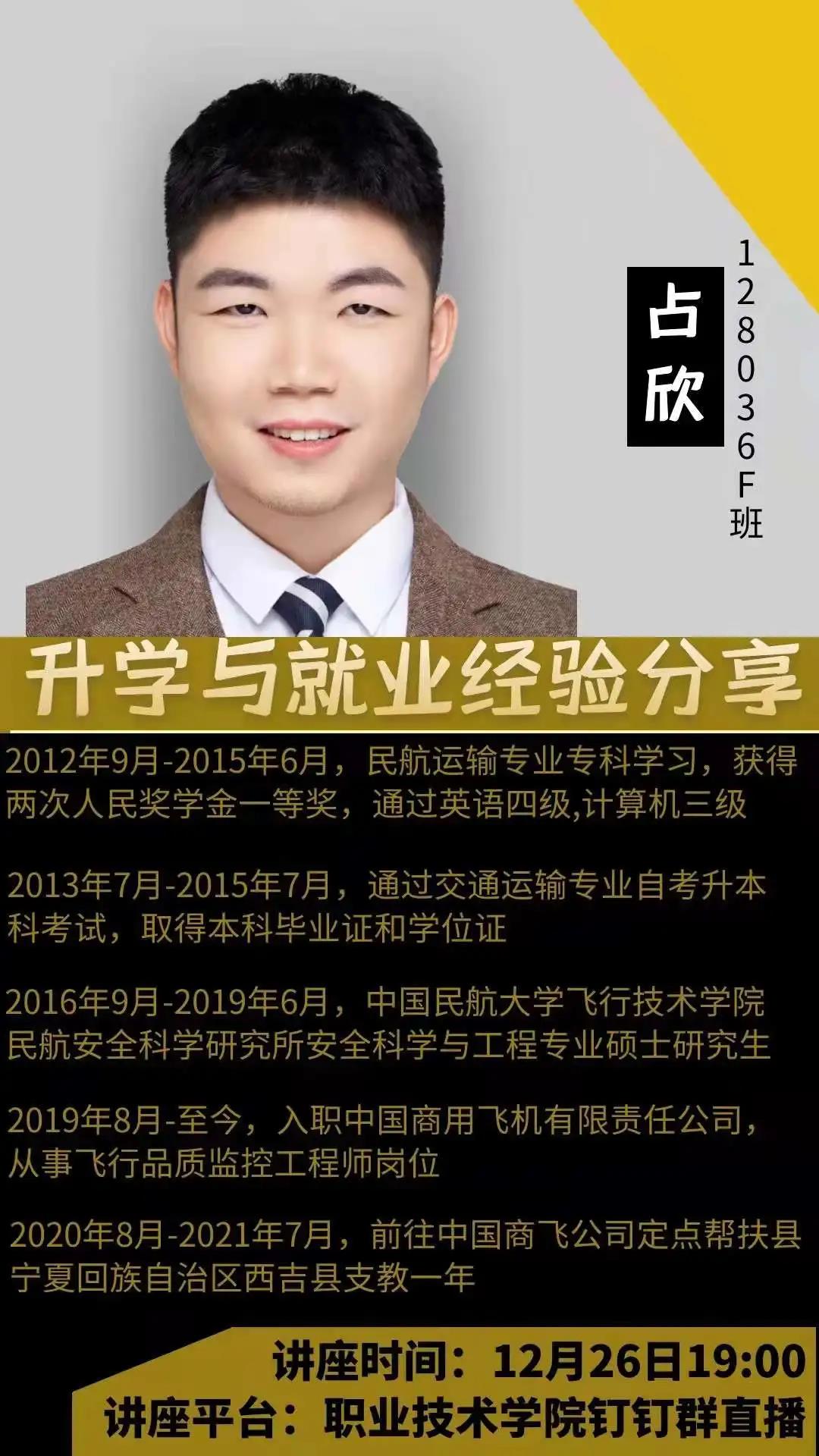 为了让同学们进一步了解学历提升对未来就业的积极作用,让同学们拥有更多可参考的学历提升经验,拥有更清晰的未来规划和更明确的奋斗目标,12月26日晚上,职业技术学院组织开展升学与就业经验分享讲座,本次讲座邀请了2012级占欣学长主讲,以线上直播的方式召开,各年级同学积极参加。