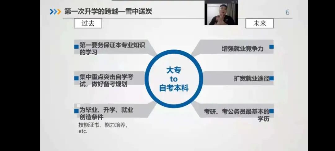 学历提升方面,从专科生到本科生再到研究生,他指出每一次升学的跨越都是未来就业的铺垫。学长建议同学们要先确立好自己未来就业的方向,选择相应的专业,有针对性地去提升学历,并且在每一次考试前要做好复习规划,达到事半功倍的效果。