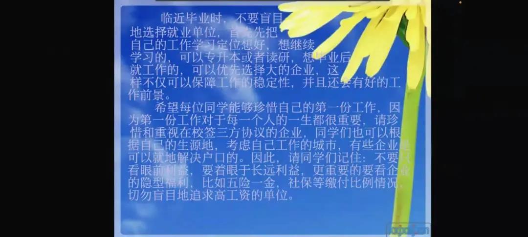 学姐强调了实习中的注意事项,如在实习期间勤奋谦虚,多做多问,尊重前辈等。学姐还为同学们讲解了实习的重要性,并为想要实习的同学提供了宝贵的建议—不要盲目追求高工资,要着眼于长远利益,优先选择有好的工作前景的企业等。