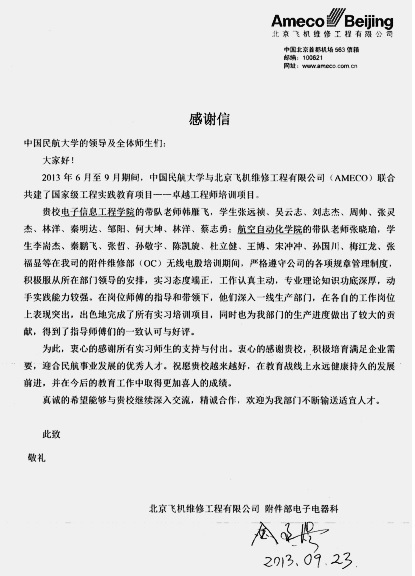 联合北京飞机维修工程有限公司(AMECO)建立国家级工程实践教育中心,携手天津航大雄英航空工程有限公司建立飞机内场维修综合实验室,通过真实企业环境,培养学生严谨踏实的工作作风和团结协作精神及解决民航工程实际问题的能力,学生经过在企业一线的顶岗培养,各方面能力得到较大提高,得到了企业高度评价。
