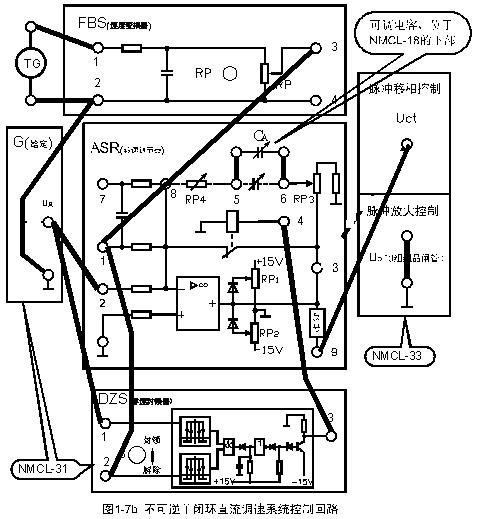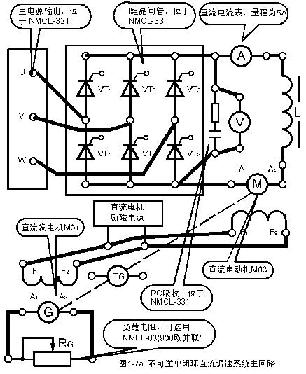 双闭环晶闸管不可逆直流调速系统由电流和转速两个调节器综合调节,由于调速系统调节的主要量为转速,故转速环作为主环放在外面,电流环作为付环放在里面,这样可抑制电网电压波动对转速的影响,实验系统的控制回路如图1-8b所示,主回路可参考图1-8a所示。