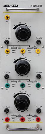由三组双联的瓷盘可调电阻组成可调电阻。每相有同轴固定的两只电阻,通过一只旋钮进行连调。其中,上部两只电阻可调范围为0 ~ 900Ω,允许电流为0.41A,下部一只电阻可调范围为0 ~ 90Ω,允许电流为1.3A,为了防止电流过大损坏电阻,每只电阻串接了一个相应容量的熔断器。