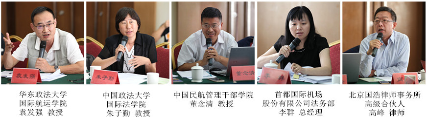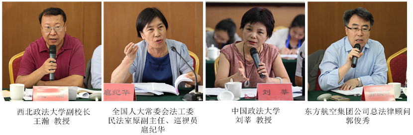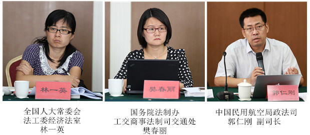中国国际私法学会副会长、西北政法大学副校长王瀚教授,全国人大常委会法工委民法室原副主任、巡视员扈纪华同志,中国法学会行政法学研究会副会长、中国政法大学刘莘教授,中国法学会航空法学研究会副会长、东方航空集团公司总法律顾问郭俊秀,北京航空航天大学法学院院长龙卫球教授,中国法学会航空法学研究会秘书长、中国民航大学法学院副院长杨惠教授,南京航空航天大学法律与政府管理学院院长王建文教授,清华大学法学院党委副书记程啸教授,中国刑法学研究会副秘书长、北京师范大学刑事法律科学研究院副院长阴建峰教授,华东政法大学国际航运学院袁发强教授,中国政法大学国际法学院朱子勤教授,中国民航管理干部学院董念清教授,首都国际机场股份有限公司法务部李群总经理,中国法学会航空法学研究会常务理事、北京国浩律师事务所高级合伙人高峰律师等专家学者参加会议。最高人民法院行政审判庭梁凤云审判长,郑州航空工业管理学院法学院副院长杜勤副教授提交了书面修改意见。