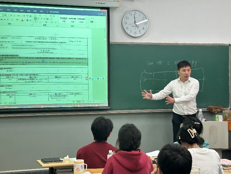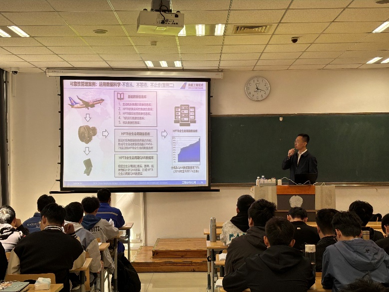 闫玉益工程师2006年毕业于中国民航大学飞行器动力工程专业,他来到《航空发动机设计与维修》课堂,在4个学时的授课过程中,结合现役的PW1100G和CFM56两款发动机的实际运行情况,带领同学们走进故障调查的过程。分享了自己在进行了500余次孔探检查后,从海量的数据中寻找线索,通过团队合作一步步揭开了故障神秘面纱的经历。所在团队从发动机设计构型、性能参数、材料特性等多个角度深入剖析失效原因,所提出的针对性的改进维护方案使之前频发的故障骤然减少,为南方航空降低了3亿余元的运维经济成本,并被推广到全球民航发动机维修领域。