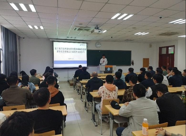 王伟工程师2014年毕业于中国民航大学中欧航空工程师学院,他走进《航空发动机机队管理》课堂,在4个学时的授课过程中,为同学们讲解了航空发动机服务通告管理和维修理念的发展与创新。详细介绍了持续适航性文件的主要内容,阐述了发动机趋势监控、维修理论和可靠性的发展变迁,结合具体案例讲述了服务通告工程指令文件来源和南方航空工程管理理念,解答了同学们提出的有关专业问题。