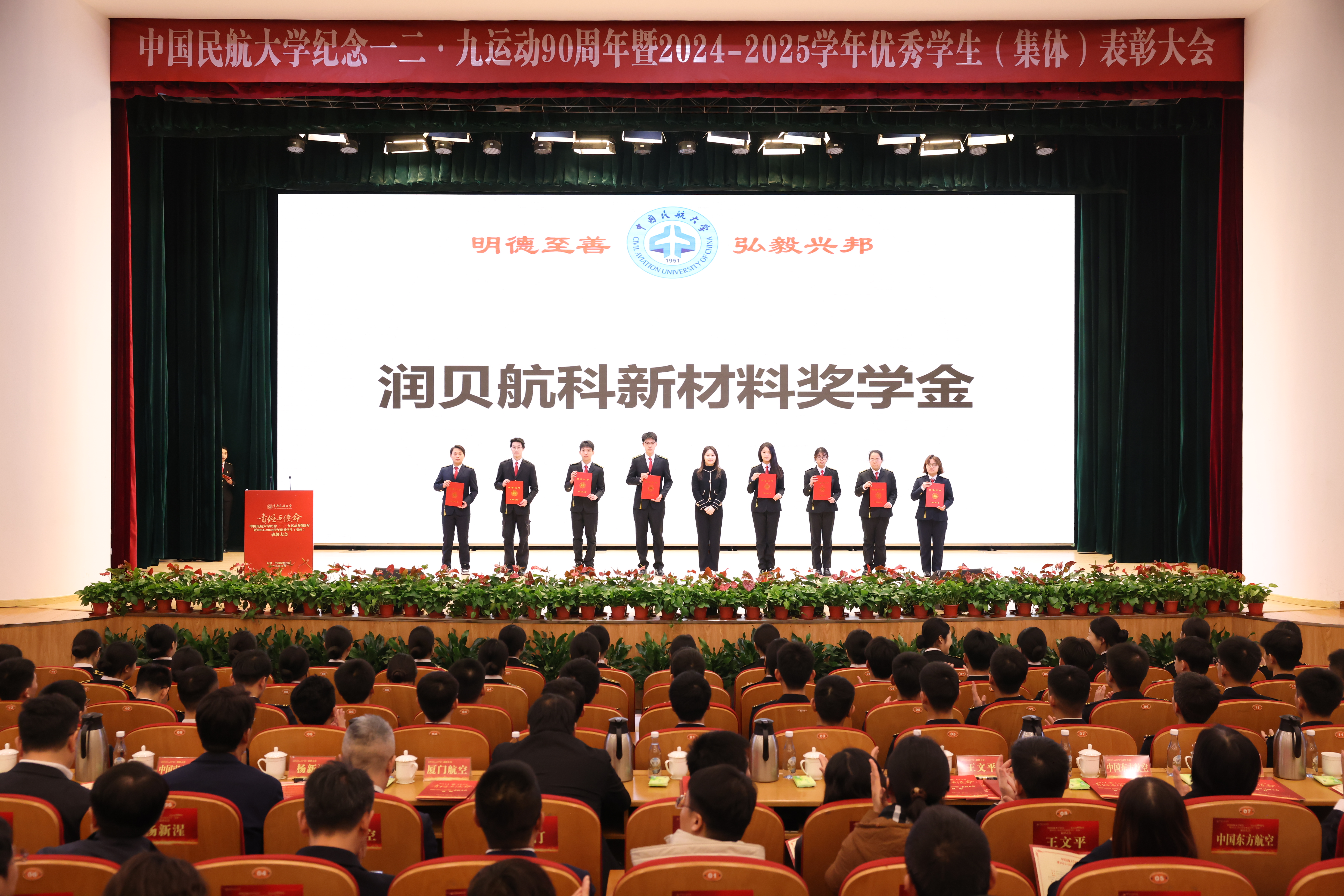 2025年12月12日,中国民航大学纪念一二·九运动90周年暨2024-2025学年优秀学生(集体)表彰大会在东丽校区北区礼堂举行。我校有幸邀请到首次设立中国民航大学“润贝航科新材料奖学金”的深圳润贝航空科技股份有限公司企业代表莅临活动现场,为本年度获得“润贝航科新材料奖学金”的优秀学生颁奖。