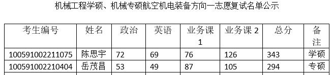 复试名单公示-机械工程学硕、机械专硕航空机电装备方向一志愿