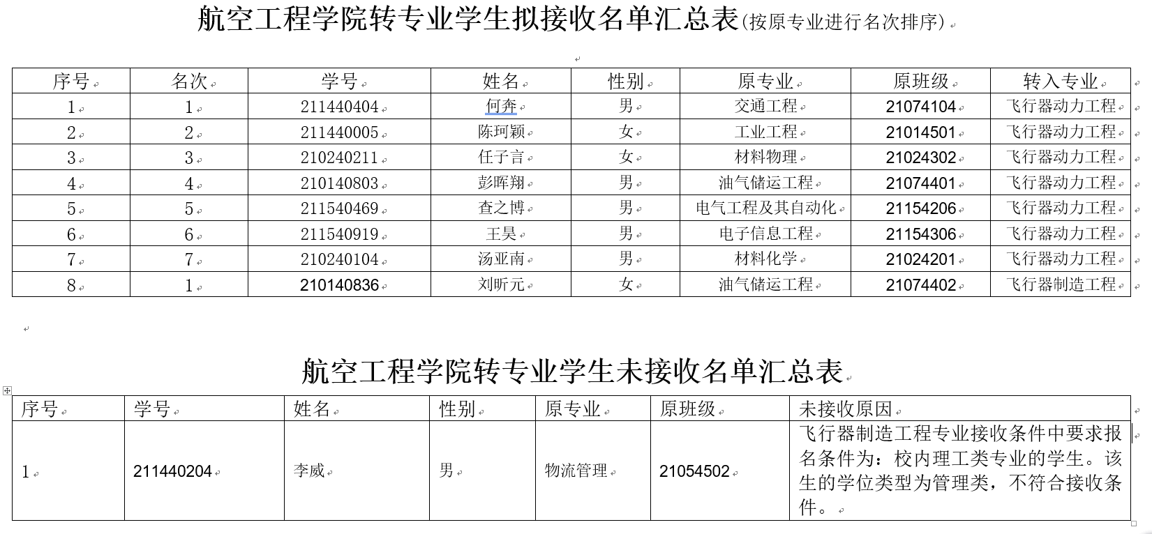 按照《航空工程学院2022年度本科转专业方案》,经过学生自主申报,学院审核环节,现对我院2022年度转专业拟接收和未接收情况进行公示,公示时间2022年5月18日-19日(2天)。在公示期间内,如有异议,或有其他需要反映的问题,可通过公示电话、办公留言或直接找院领导反映情况。