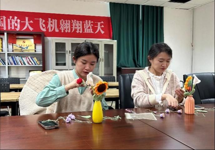 阳春三月,微风拂面,为进一步丰富学院文化,活跃工作氛围,展示女工风采,3月15日下午,航空工程学院在北教3-314室开展了毛线花手工制作活动。活动邀请到为2022年冬季奥运会制作花束的马蕾老师,在这个阳光明媚的春日里,女教工们用五颜六色的毛线绳编织出一朵朵美丽的花朵。