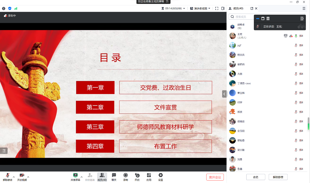 7月7日,航空工程学院发动机系党支部利用“腾讯会议”线上组织开展了主题为“师德师风教育——做‘经师’和‘人师’相统一的‘大先生’”的党日活动,发动机系全体教师参加,航空工程学院副院长彭志广出席。