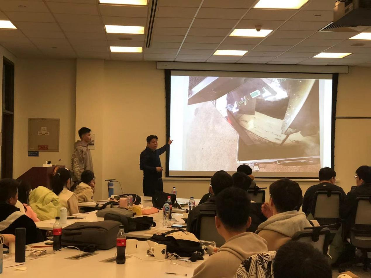 在企业实习实践项目开展中,学生开展了普惠最新型号发动机PW1100G的系统熟悉,对照发动机车间的真实发动机开展了系统识别,结合实际案例对发动机机队管理中涉及的发动机状态监控、性能分析、成本分析、大修计划等进行系统方案设计。开展了V2500发动机部件拆装、PW4000系列发动机系统校装、发动机孔探检查与损伤分析等实际操作项目,拓宽了学生的知识面,使学生在安全的环境下认识了民航维修中的实际工作。本次实习的考核环节设计了贯穿全程的分组实践项目,在实习开始布置了分组任务,在实习过程中引入任务必要知识,引导学生自主学习,学生分组研究任务内容的解决方法,并利用空余时间完成小组任务,不仅将实习中所学的专业知识应用于小组任务,也必须考虑涉工程实际中的时间、成本、库存等非技术因素,使学生解决复杂工程问题的能力得到了提升。在实习的最后一天各小组做了详细的任务报告,实习单位教员在对学生的工作成果给予充分肯定的同时也指出了改进的方向。实习学生代表王景风通过短视频的方式展现了一周实习的感受,实习学生班长沈维峰说:“在这一周充实、精彩的实习中充分感受了民航企业安全、规范、高效等企业文化,对民航发动机维修工程产生了浓厚的兴趣,未来将向着更高的目标迈进。” 发动机系主任曲春刚、实习学生班导师张莹、实习课程负责人王炫出席并观摩了各小组的报告。