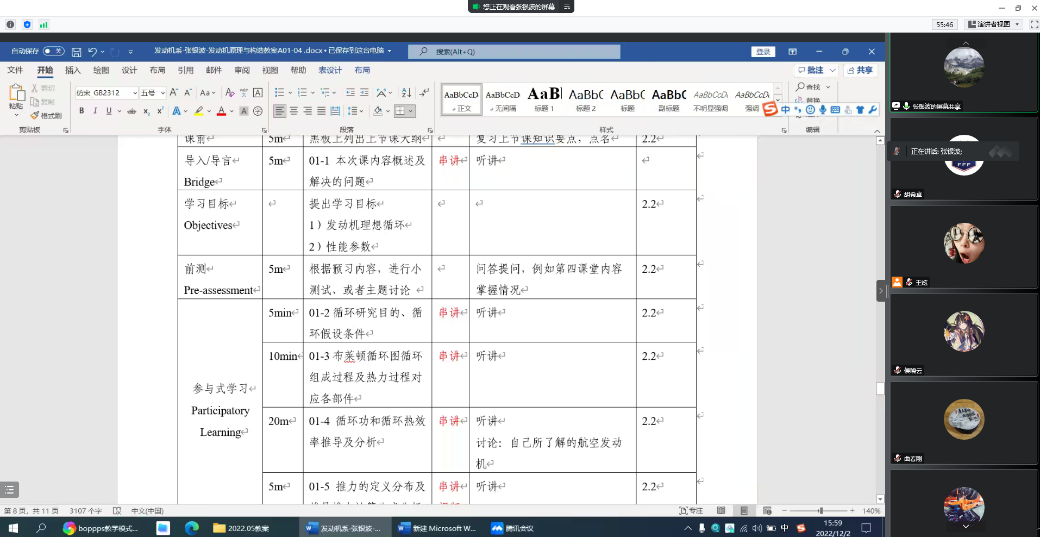 在交流环节中,老师们开展了教案研讨和课程思政交流活动。张银波老师结合撰写的《发动机原理和构造》课程教案介绍了BOPPPS教学模式的来源和教案中各部分的具体要求;何振鹏老师以《机械设计基础》为例分享了教案中思政元素的融合。