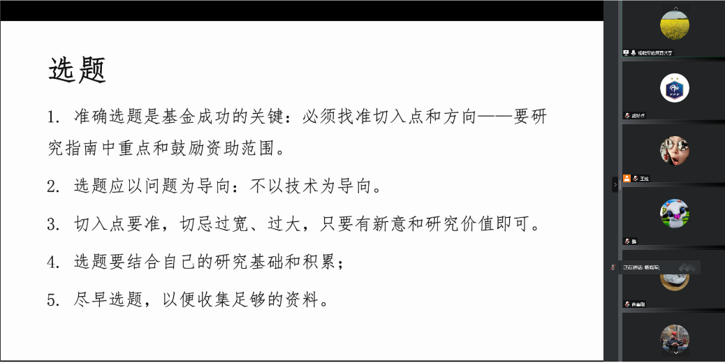 作为本学期的最后一次党日活动,专业负责人杨晓军老师针对寒假期间的自然基金撰写和申报,建议老师们提前做好准备工作,并围绕选题、研究内容、研究思路、前期基础、形式审查、科研诚信几个方面分享了经验和心得体会。