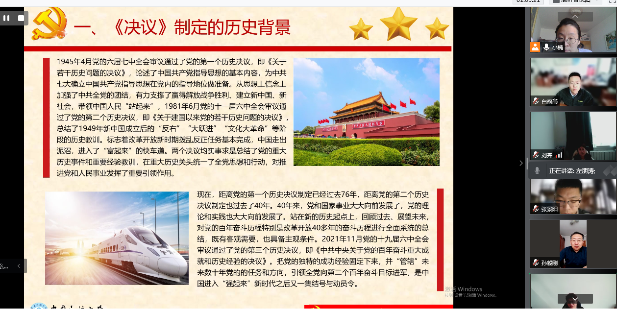 首先,由行政机关党支部左朋涛同志进行《中共中央关于党的百年奋斗重大成就和历史经验的决议》导学,他从《决议》制定的历史背景、主要内容以及重大意义三个方面带领与会党员共同学习党的百年奋斗重大成就和历史经验,深入浅出地解读了《决议》的“两个特点”、“三个亮点”。他指出,《中共中央关于党的百年奋斗重大成就和历史经验的决议》是党的第三个历史决议,意义重大,《决议》向全党全国各族人民发出了号召,我们要深入学习领会党的十九届六中全会精神,以史为鉴、开创未来,埋头苦干、勇毅前行,为实现第二个百年奋斗目标、实现中华民族伟大复兴的中国梦而不懈奋斗。