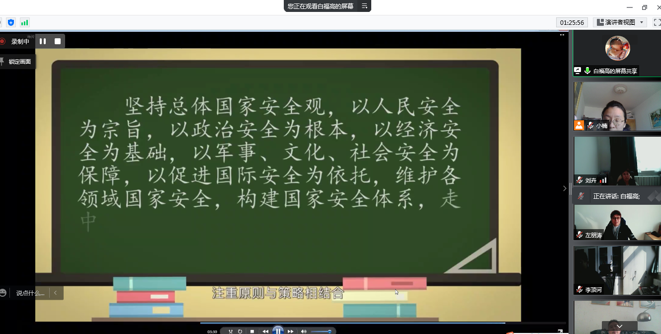 接着,结合第7个全民国家安全教育日活动,井冈山党支部书记白福高组织党员们视频学习国家安全教育知识,通过学习《国家安全法》、《总体国家安全观》,进一步增强党员们维护国家安全意识和风险防范意识。