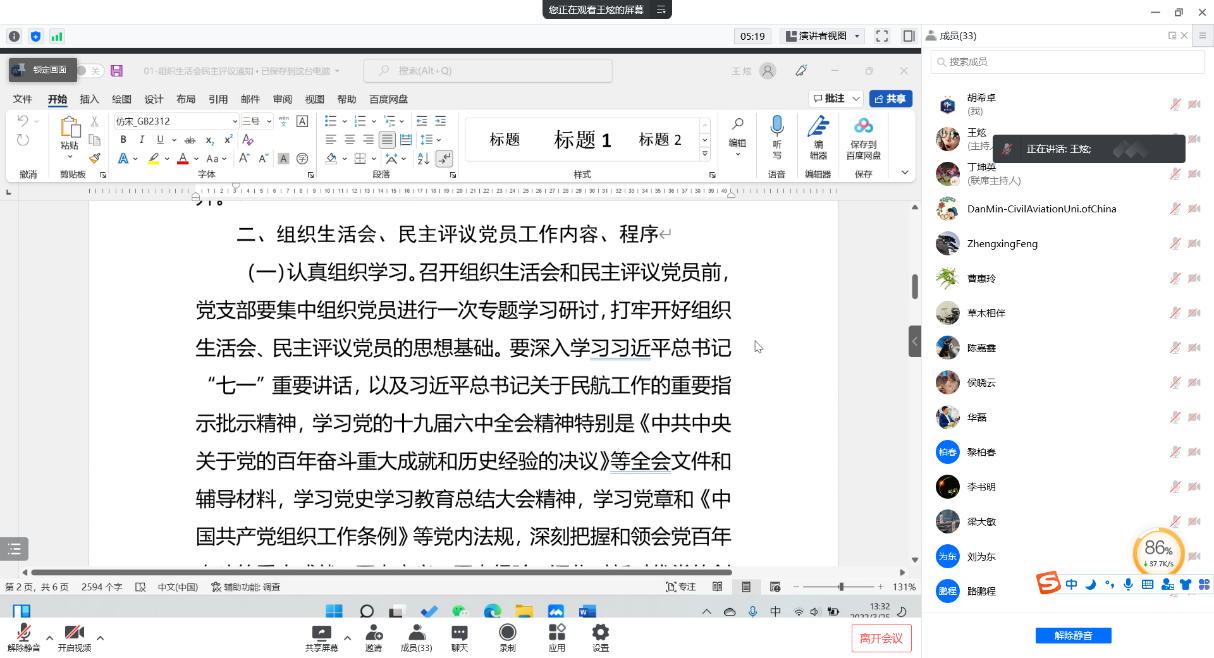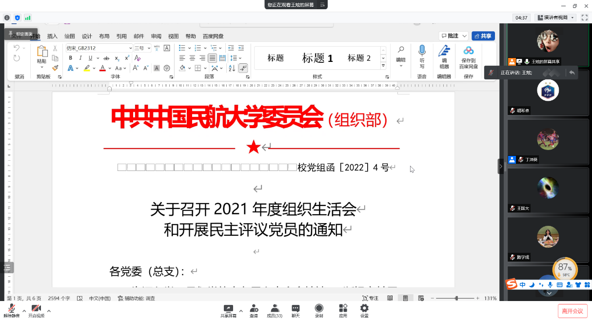 会议最后,彭院长对本次组织生活会进行了总结和点评,通过支委会的工作报告、问题查摆,以及各位党员对自身问题的剖析,能感受到各位党员同志端正的态度和进步的决心,希望各位老师可以向着各自所签署的党员承诺书中所写的方向不断完善自己,为学院学校顺利完成“十四五”工作目标做出贡献。他强调,最近一段时间由于新冠疫情发展形势的复杂多变,防控要求也趋于严格,希望各位党员教师做好排头兵,以先锋模范作用完成好当前的在线教学工作,也希望在今后的教学工作中发挥创新精神,实现更好的教学效果。彭院长高度肯定了发动机系老师们在特殊时期的教学工作中克服重重困难所付出的努力,呼吁各个课程组召开研讨会交流线上教学经验,各位班导师也应及时对各自班级学生做好心理疏导和学业辅导,保证学生健康成长、成才,促进学院完成本科教育教学改革既定目标。