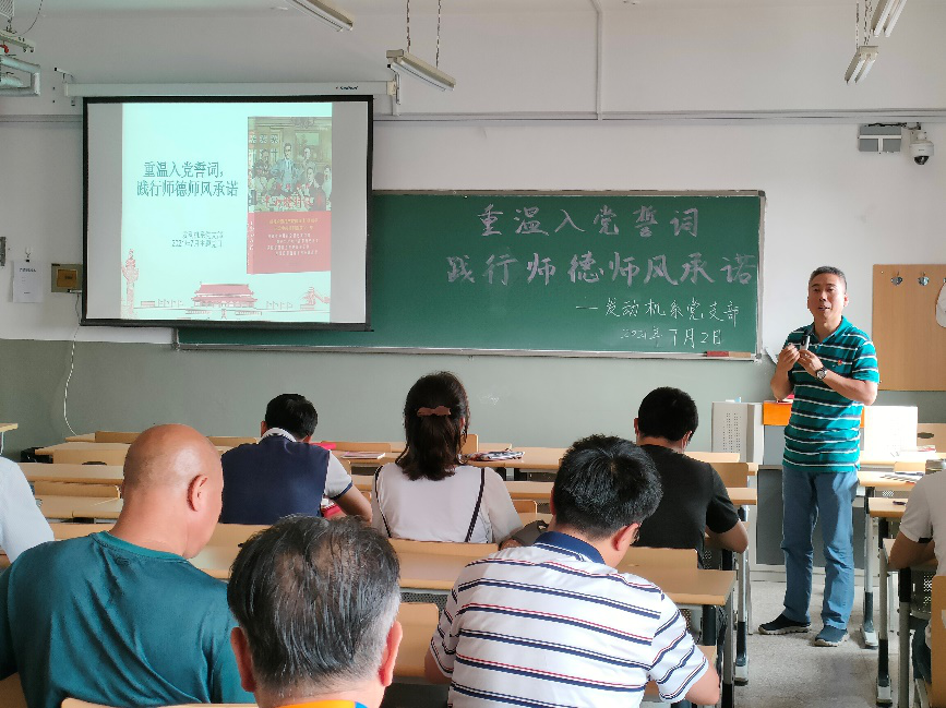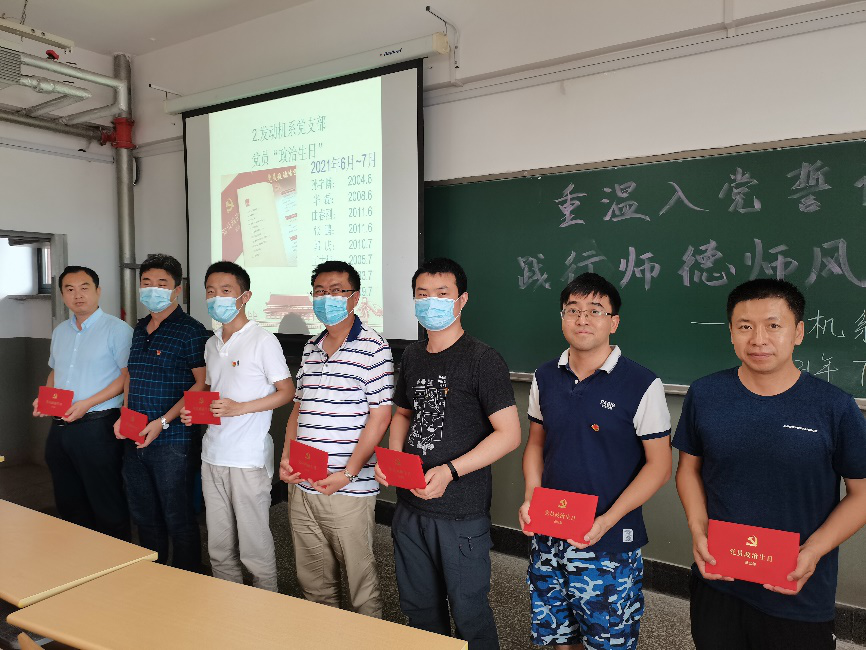 7月2日,发动机系党支部在北教四-301线下组织了主题为“重温入党誓词,践行师德师风承诺”的党日活动,发动机系全体教师参加,航空工程学院副院长彭志广出席。会上,支部副书记王炫带领老师们回顾了保密工作优良传统教育纪录片《密事解码——庆祝中国共产党成立100周年》的内容,并对纪录片中的要点进行了解读。全系教师对签署的师德师风承诺书践行情况开展了研讨交流,明确了下一步如何确保新时代高校教师职业行为十项准则落到实处。鉴于即将迎来的期末考试监考任务,王老师传达了学校和学院关于加强期末考试纪律的通知要求。系主任丁坤英关于全系近期的AABI专业认证、国家一流本科专业建设和2020版培养方案和课程大纲等几项重要工作进行了部署。支部书记于军力带领党员教师重温入党誓词,向本月迎来政治生日的七位老师颁发贺卡,张宗卫老师代表七位老师发表了政治生日感言。随后,全系党员、入党积极分子、民主党派和无党派人士集体学习了7月1日习近平总书记在庆祝中国共产党成立100周年大会上的重要讲话精神。王老师和纪检委员徐美健关于学校工会组织的“我心向党”教职工红色观影活动的参与方式和要求进行了介绍。在党史学习环节中,老师们观看了电影《决战之后》的影片赏析。会议最后,彭院长对本次主题党日活动进行了总结和点评,关于党史学习、国家一流本科专业建设和2020版培养方案和课程大纲等工作提出了要求。